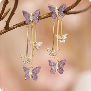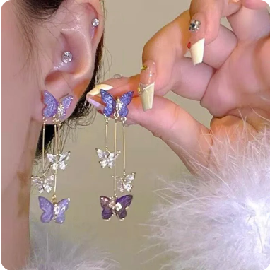 Com uma borboleta roxa feita de cristais luxuosos, este brinco é a personificação da sofisticação. Seu design elegante e refinado adiciona um toque de glamour a qualquer visual, elevando-o instantaneamente para um nível superior de elegância.